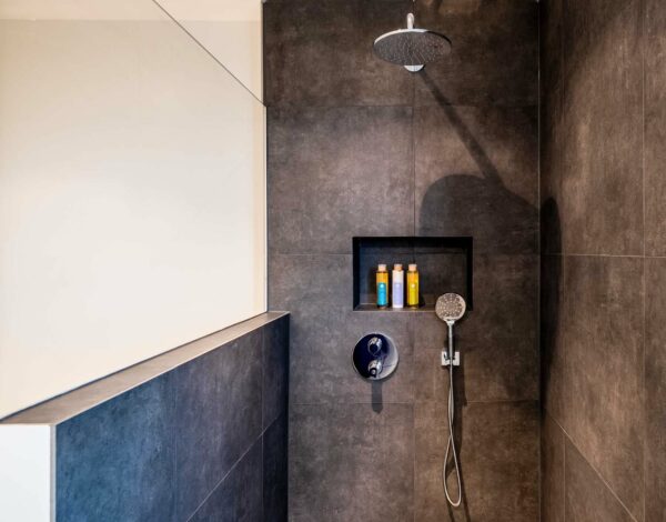 Als je nét iets te weinig ruimte hebt voor een douchebak, dan kan je de douchebak een beetje inkappen in de muur. Dit is eenvoudig bij snelbouwsteen, omdat die holle ruimtes heeft. Zorg dan wel dat de douchebak voldoende brede, rechte randen heeft. In dit geval komen immers de tegels uit bovenop de douchebak.